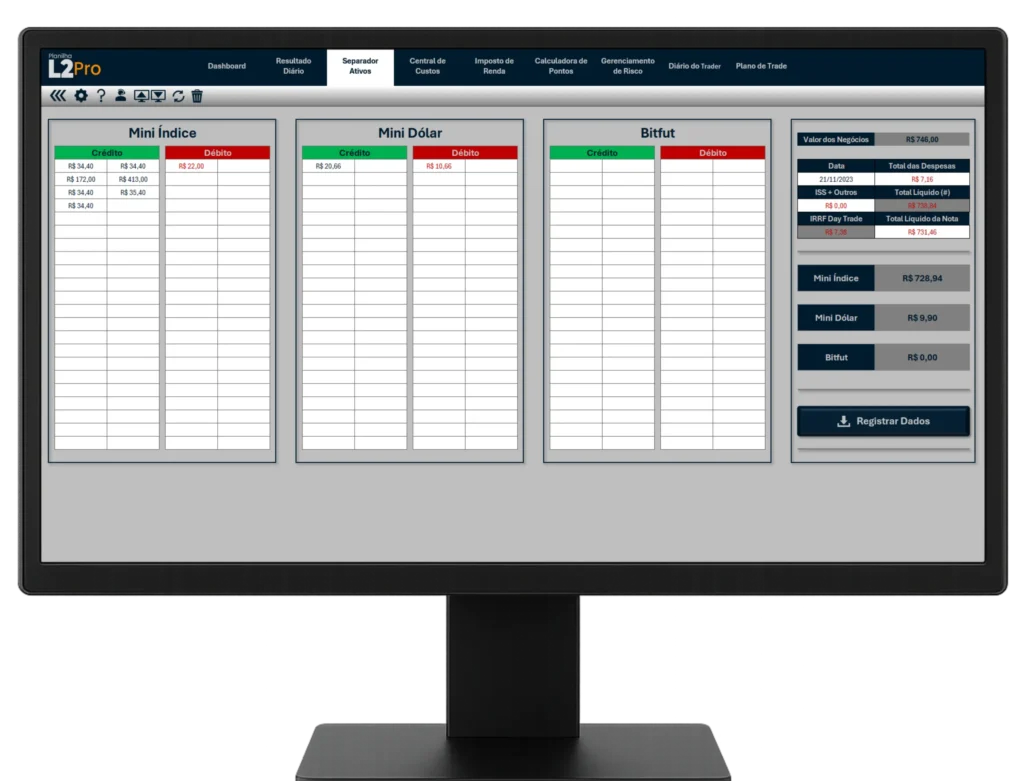 “Mais que uma planilha: um sistema completo para organizar suas operações, calcular impostos e acompanhar a evolução dos seus resultados no Day Trade em um só lugar.”